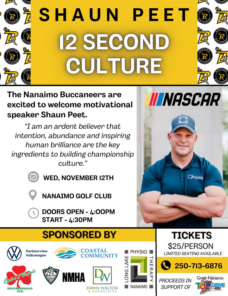 Nicole Brandenburg and the Nanaimo Buccaneers Junior A team are pleased to host the Shaun Peet speaking engagement on Wednesday, November 12th.