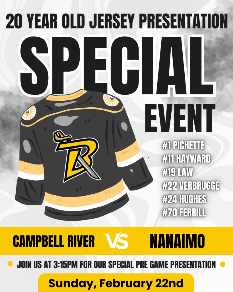 Next up: The Buccaneers will face off against Campbell River at 3:15 pm at the Nanaimo Ice Centre tomorrow, February 22nd. It’s a special event—join us in celebrating our 20-year-old graduates and a special jersey presentation, happening just before puck drop.