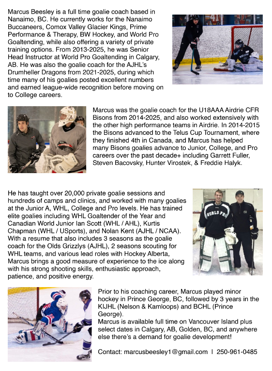 Beesley joined the Bucs in September after relocating from Alberta, where he spent more than 12 years developing elite netminders with World Pro Goaltending. His experience and technical expertise have already produced impressive results within the Buccaneers’ crease.